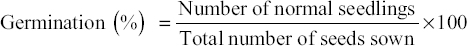 Four hundred seeds used for conducting the seed germination test by roll towel method [11], the temperature and RH maintained at 25 ± 2°C and 95 ± 2%, respectively. At end of the test on 7th day, the total number of normal seedlings was counted and expressed in percentage.