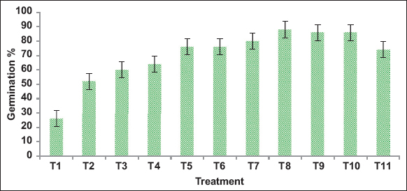 ![]() | Figure 1: Effect on gibberellic acid (GA3) treatments on germination percentage of black gram. Treatment details: T1 – Control, T2 – 50 ppm, T3 – 100 ppm, T4 – 150 ppm, T5 – 200 ppm, T6 – 250 ppm, T7 – 300 ppm, T8 – 350 ppm, T9 – 400 ppm, T10 – 450 ppm, and T11 – 500 ppm. [Click here to view] |