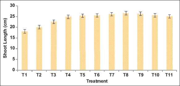 ![]() | Figure 3: Effect on GA3 treatments on shoot length (cm) of black gram. Treatment details: T1 – Control, T2 – 50 ppm, T3 – 100 ppm, T4 – 150 ppm, T5 – 200 ppm, T6 – 250 ppm, T7 – 300 ppm, T8 – 350 ppm, T9 – 400 ppm, T10 – 450 ppm, and T11 – 500 ppm. [Click here to view] |