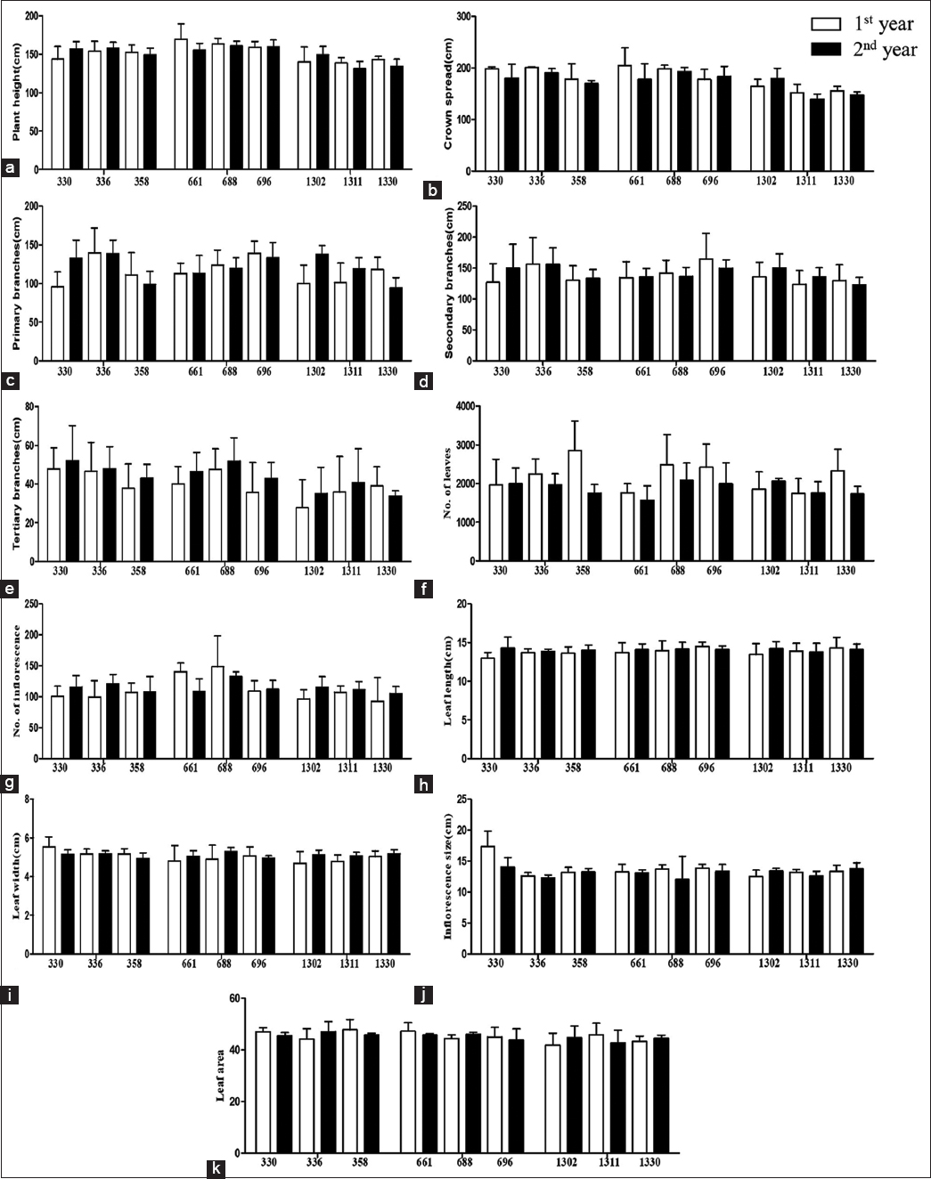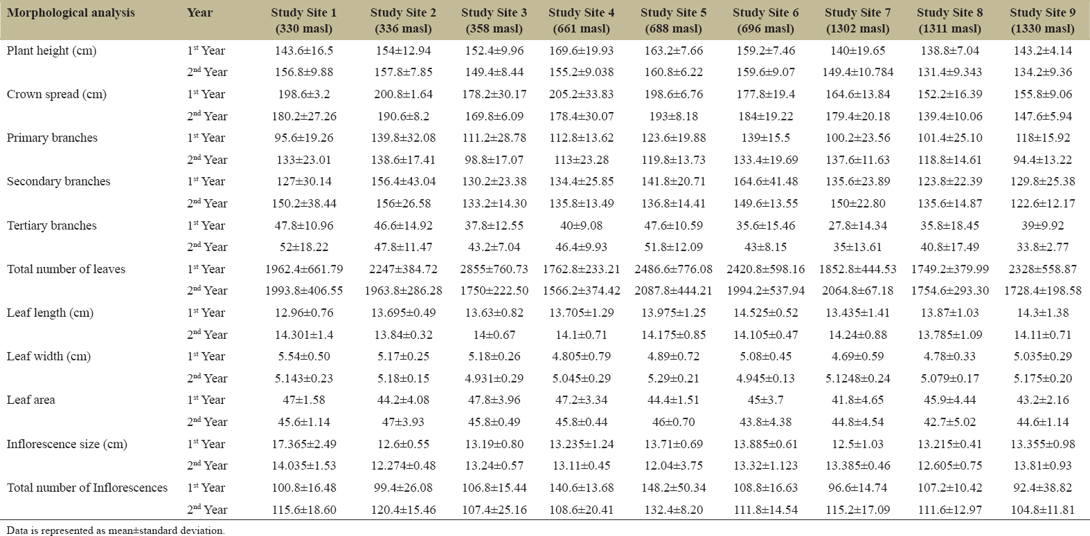 To study the morphological variability among plants, following growth characteristics, namely, plant height, crown spread, inflorescence size, and leaf length as well as leaf width were measured and expressed in centimeters whereas number of leaves, number of branches, and number of inflorescences were counted.