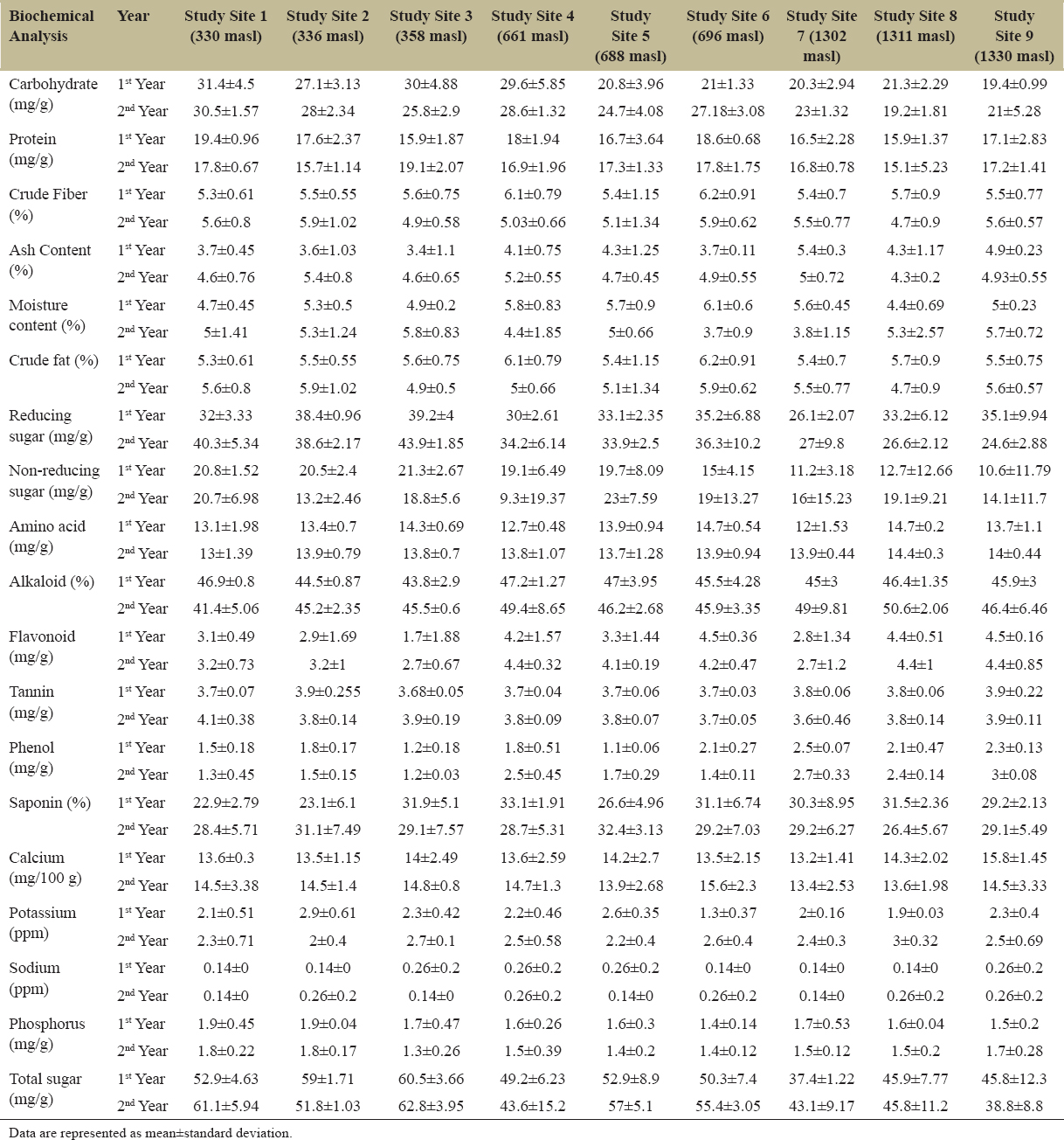 Fluctuations in environmental circumstances with varying altitudinal gradients account for variations in plants. This study was performed to scrutinize the impact of varying altitudes on the medicinal plant, namely, Justicia adhatoda L. for 2 consecutive years. The phytochemical, physicochemical constituents and morphological aspects of Justicia adhatoda L. were studied and statistically compared. Significant variations were observed among plant height, crown spread, branches, leaves, inflorescence, carbohydrates, phenols, flavonoids, total sugar, and reducing sugar across different elevational sites where the observed variations showed that Justicia adhatoda L. plant chemically adapted itself to sustain at high altitudinal sites by exhibiting a change in its phytochemical and morphological aspects. The quality and therapeutic efficacy of medicinal plants are influenced by their biochemical composition, which, in turn, depends on the environment in which they grow. The various biotic and abiotic stresses operating in the environment across altitudinal gradients undeniably perform as a driving force behind these variations and ultimately the survival of medicinal plants. The assessment of the biochemical composition of medicinal plants growing at different elevational sites can contribute to selecting the best genotype and better altitude for commercial cultivation of medicinal plants.