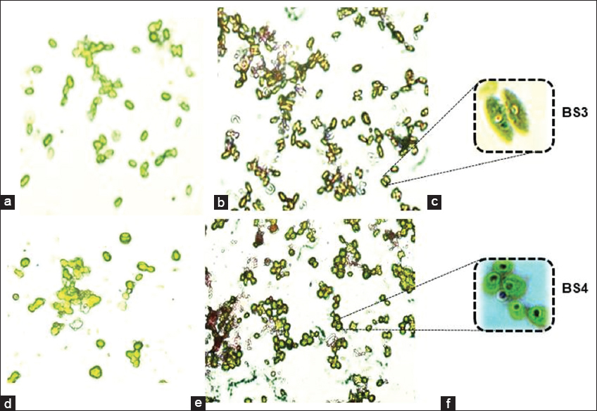 ![]() | Figure 1: Microscopic observation of mangrove ecosystem derived algal isolates (a) BS3 isolate’s microscopic view at ×400 magnification; (b) BS3 isolate’s microscopic view after Sudan black staining under ×400 magnification; (c) BS3 isolate’s microscopic view after SB stain in ×1000; (d) BS4 isolate’s microscopic view under ×400; (e) BS4 isolate’s microscopic view after staining; (f) BS4 isolate’s microscopic view after SB stain in ×1000). [Click here to view] |