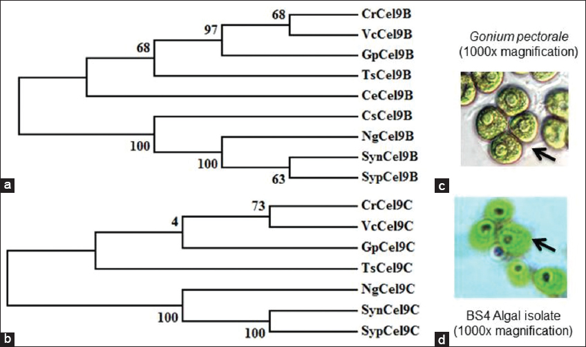 Microscopic observation had played a very important role to identify the morphological characterization of algal communities through physical appearance with or without staining applications. Two mangrove algal isolates, that is, BS3 and BS4 had been successfully visualized under bright field microscopy without staining as algae contain photosynthetic pigments in its cellular biomass. Microscopic examination had demonstrated the morphological and physiological diversity of two different isolates at ×400 [Figure 1] and ×1000 magnification [Figure 1b and e] using algae culture of the 9th day. Microscopic observation had shown that BS4 has a very close morphological resemblance with the microscopic view [50] of the algal regime Gonium pectorale [Supplementary Figure S1, Figure 2c and d]. However, BS3 did not show any similarity considering the microscopic characteristics of chosen algal communities. Interesting phylogenetic analysis had also shown that G. pectorale algae [50] were closely associated clade to C. reinharditii as phylogenetic analysis considering Cel9B and Cel9C cellulase and/or endoglucanase protein sequences in this present study [Figure 2a and 2b]. However, it would be impossible to place this alga taxonomically based on microscopic observation and in-silico molecular phylogenetic analysis. Therefore, more work on the molecular and physiological levels would be required to firmly establish the taxonomy of this strain. For the purposes of this article, this strain will be referred to as BS4 algal isolate from the mangrove ecosystem.