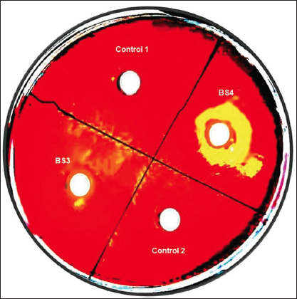 | Supplementary Figure S2: Cellulase plate assay (qualitative) for Congo red degradation. Breakdown the Congo red mixed BBM agar media enriched with carboxy methyl cellulose shows the orange hollow zone around the groove which signifies the cellulolytic activity of BS4. [Click here to view] |