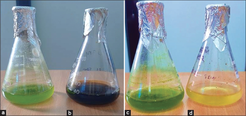 ![]() | Figure 4: Dye decolorization analysis using algal isolate BS4 (0–9 days). These pictures signify the congo red decolorizing activity (96.04%) of BS4 in BBM algal growth medium within 9 days. Dye decolorization assay before the treatment (0 days) without Congo red (a), with Congo red (b) and dye decolorization assay after the treatment (9 days) Without Congo red (c), With Congo red (d). [Click here to view] |