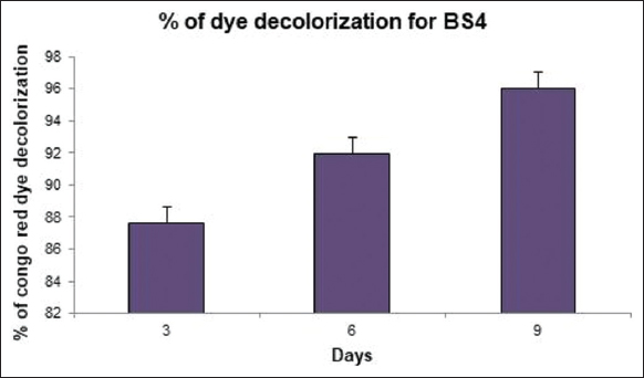 ![]() | Figure 5: Determination of dye decolorization analysis using algal isolate BS4 (Decolorizing activity was highest (96.04%) of BS4 in BBM algal growth medium within 9 days; n = 3 where n is the number of best replicates). [Click here to view] |