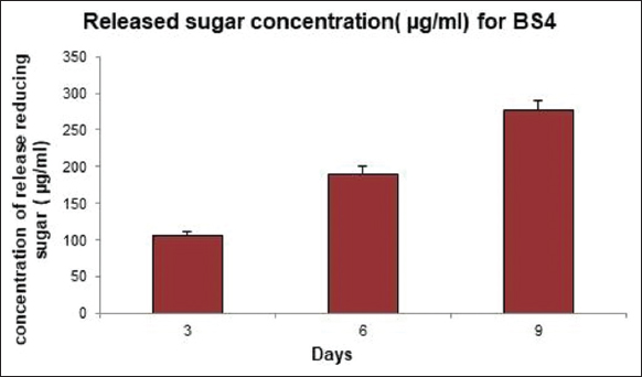 ![]() | Figure 6: Measurement on reducing sugar release after cellulose degradation using algal isolate BS4 (Released reducing sugar has been estimated by DNS assay and BS4 released the highest amount of reducing sugar within 9 days, that is, 276.72 mg.ml-1; n = 3 where n is the number of best replicates). [Click here to view] |