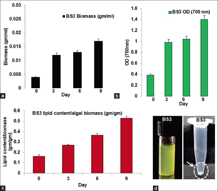 ![]() | Figure 7: Biomass and lipid production profile using BS3 algal isolate from mangrove ecosystem (a) BS3 isolate’s growth curve where day-wise biomass increases; (b) BS3 isolate’s growth curve where day-wise OD increases; (c) BS3 growth curve while day-wise lipid content/algal biomass increases; (d) BS3 algal pure culture and the extracted lipid as dried white pellet). [Click here to view] |