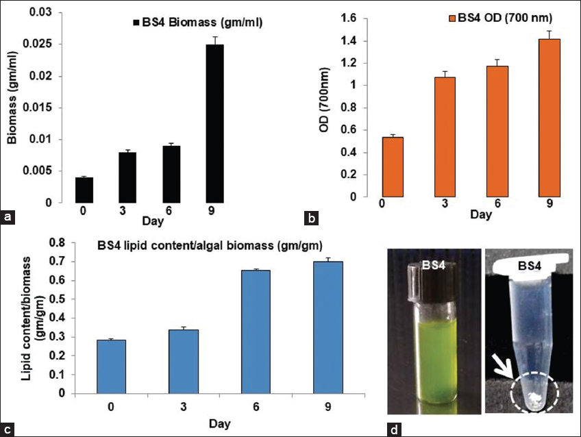 ![]() | Figure 8: Biomass and lipid production profile using BS4 algal isolate from mangrove ecosystem (a) BS4 isolate’s growth curve where day-wise biomass increases; (b) BS4 isolate’s growth curve while day-wise O.D. increases; (c) BS4 growth curve where day-wise lipid content/algal biomass increases; (d) BS4 pure culture and the extracted lipid as dried white pellet). [Click here to view] |