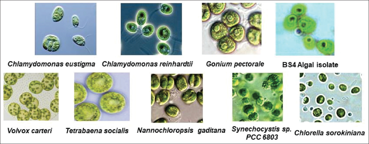 | Supplementary Figure S1: Comparative microscopic overview on diverse algal regimes bearing Cel9B and Cel9C proteins as phenotypic trait to degrade cellulosic materials. Microscopic views are not in uniform scale but photographs have been taken at ×1000 magnification under oil immersion toward comparison with BS4 algal isolate used in this present study and reference microscopic views have been adopted from mentioned references as standard reference to make comparative overview in comparison to BS4 isolate in the present study [50,60-66]. [Click here to view] |