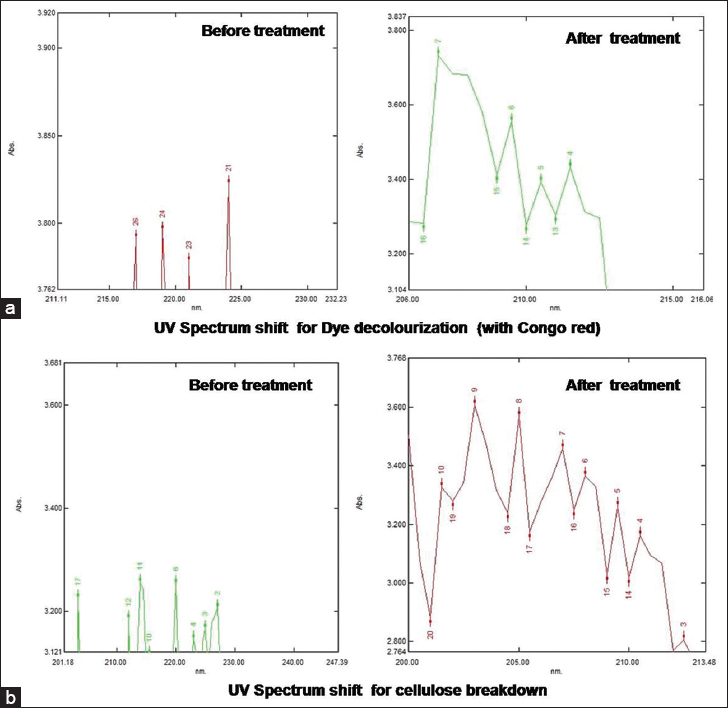 | Supplementary Figure S3: (a) These UV spectrum shifts for dye decolorization (with Congo red) signify the breakdown of Congo red within 9-day time span for BS4 isolate. Before the treatment, the highest UV absorbance spectra of Congo red were 224 nm. That was shifted to 207nm that clearly indicates the breakdown of Congo red. (b) UV Spectrum shift for cellulose breakdown signifies the breakdown of cellulose within 9-day time span BS4 isolate. Before the treatment, the highest UV absorbance spectra 214 nm. That was shifted to 203 nm that clearly indicates the breakdown of cellulose. [Click here to view] |