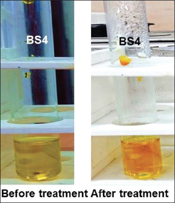 | Supplementary Figure S4: DNS assay for sugar estimation. After the treatment, BS4 shows that the amount of released reducing sugar high (deep brown color). [Click here to view] |