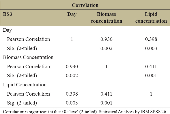 Statistical analysis was executed using IBM SPSS software (version 26.0). Correlation coefficient test (Pearson Correlation) had been accomplished for the confirmation of significance correlation at 0.05 significance levels (2-tailed) among the day, biomass concentration, and lipid concentration of pure axenic algal cultures inoculated in sterile BBM medium for small-scale experimentations [49].