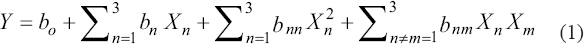 Where bo: Y intercept (constant), bn: regression coefficient for the linear effect of Xn on Y, bnn and bnm: regression coefficient for the quadratic effect on Y and Xn, Xm: independent values.