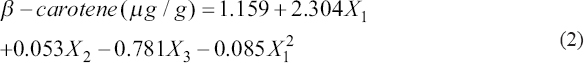 In this case, the four effects [Gac aril (X1), sugar (X2) and yeast (X3), and interact (X12)] show P value less than 0.05, indicating high confidence 95.0%. The analysis results also showed that there was no contribution of X1X2, X1X3, X22, X2X3, and X32 interactions to β-carotene content (P > 0.05). Therefore, unimportant terms can be removed from the model to improve the regression model and optimization results. Equation 2 of the fitted model is: