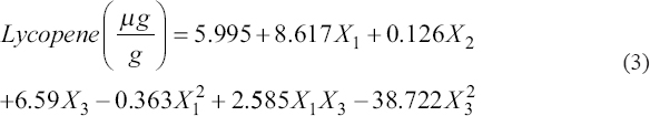 Humans cannot synthesize lycopene, so a dietary intake of lycopene is necessary to take advantage of its beneficial health properties. Many significant health benefits in lycopene, including its protective effects on cardiovascular diseases [34]. Lycopene plays an important role in chronic disease prevention according to published epidemiological, tissue culture, and animal studies [35]. The analysis of variance for lycopene content is presented in Table 3. It was observed that six effects had P < 0.05 (X1, X2, X3, X1X3, X12, and X32), indicating that they were significantly different (95% confidence level).