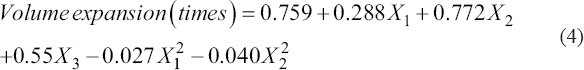 It was observed that the model as fitted with high R2 and R2 adjusted values (96.32% and 96.07%, respectively) of the variability in volume expansion. With this model, the optimal (highest) volume expansion value obtained (5.57 times) was determined when processing under the condition of combining 3 optimal parameters of gac, sugar, and yeast, respectively, which are 5.41%, 9.73%, and 0.5%.