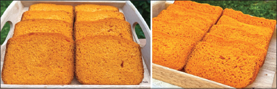 ![]() | Figure 2: Sandwich breads have been supplemented with 8.55% (M2 – left side) and 9% Gac aril (M3 – right side). [Click here to view] |