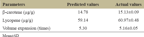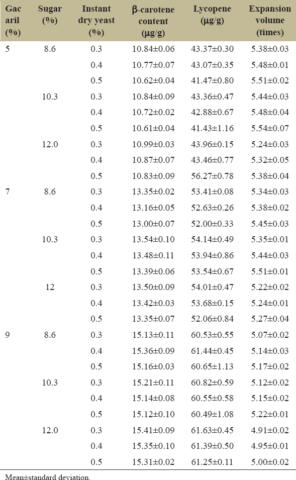 This difference is probably due to the type of yeast used and the different processing conditions. To test the optimal values found from the predictive models, sandwich bread was processed according to the optimal parameters, including Gac aril 8.55%, sugar 9.76%, and dry yeast 0.5%. The experimental results showed that β-carotene, lycopene, and volume expansion values of bread are close to the results predicted from the model, only 2.4 to 3.1% difference [Table 5], where β-carotene and lycopene were 2.4% and 3.1% higher, respectively, while the expansion volume was 2.6% lower than predicted. These differences are within the allowable limit (<5%).