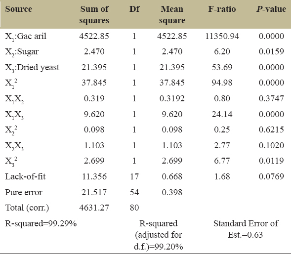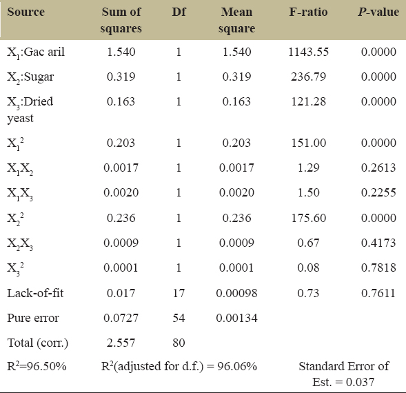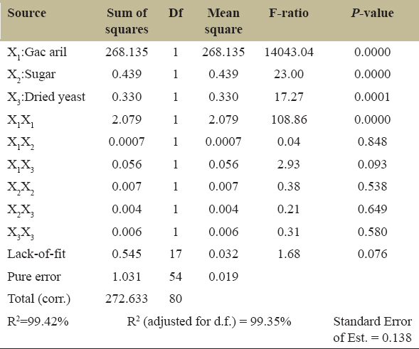 Optimizing the parameters of Gac aril (%), sugar (%), and instant dry yeast (%) were performed by multivariable regression method. The statistical significance of the model after acquisition was tested through analysis of variance (ANOVA) [Table 2].
