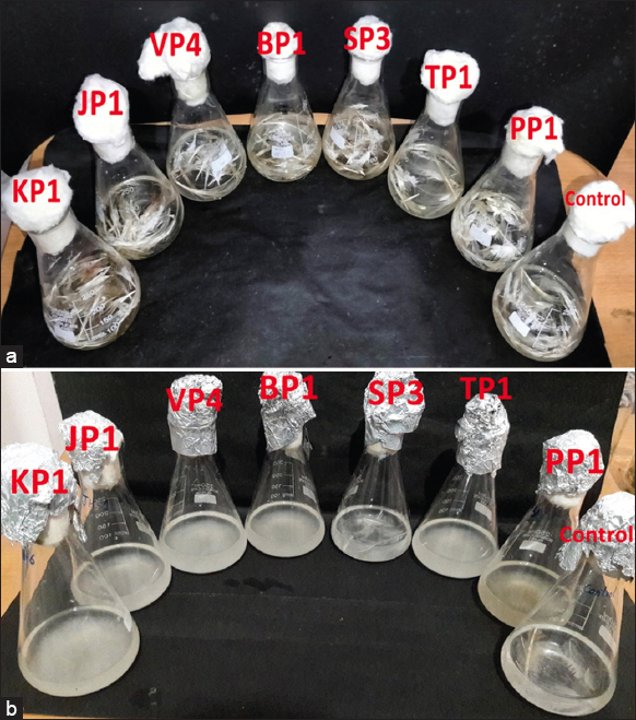 ![]() | Figure 3: Feather degradation test for selected keratinolytic bacterial isolates (a) initial stage (b) after 15 days of incubation. [Click here to view] |