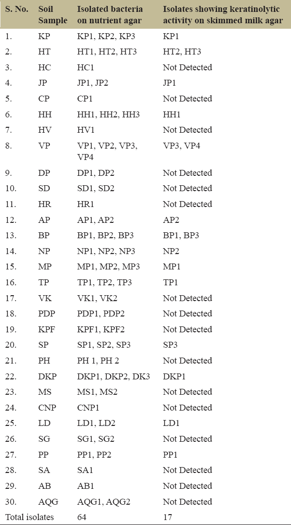 | S. No. | Soil Sample | Isolated bacteria on nutrient agar | Isolates showing keratinolytic activity on skimmed milk agar |