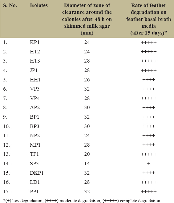 | S. No. | Isolates | Diameter of zone of clearance around the colonies after 48 h on skimmed milk agar (mm) | Rate of feather degradation on feather basal broth media (after 15 days)* |