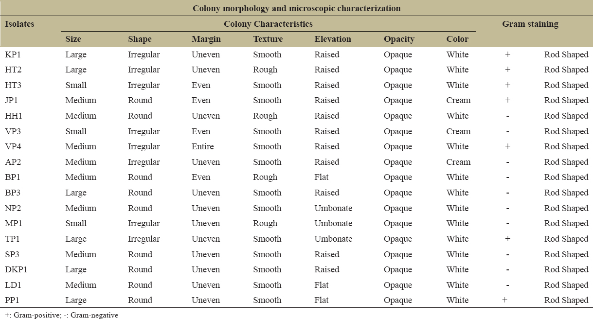 The poultry waste soil samples were collected from 30 different local poultry farming sites in Himachal Pradesh [Table 2]. For isolation of microbes 10 g of poultry, waste soil sample was transferred to 90 mL of sterilized feather basal medium. 1 mL of soil suspension serially diluted up to 7 times. The diluted sample in 0.1 mL volume from each dilution was transferred to skimmed milk agar plates. After 24 h of incubation, the microbial diversity appears on the skimmed milk agar plates, as shown in Figure 1. A total of 64 well-formed single colonies were selected on the basis of their morphological differences. All the 64 isolates were subjected to primary screening on skimmed milk agar plates. Out of 64 isolates, 17 isolates named KP1, HT2, HT3, JP1, HH1, VP3, VP4, AP2, BP1, NP2, MP1, TP1, SP3, DKP1, LD1, and PP1 demonstrated a clear zone on skimmed milk agar plates after 24 h of incubation at 37°C. The zone size was recorded in mm after 48 h of incubation [Figure 2 and Table 3].