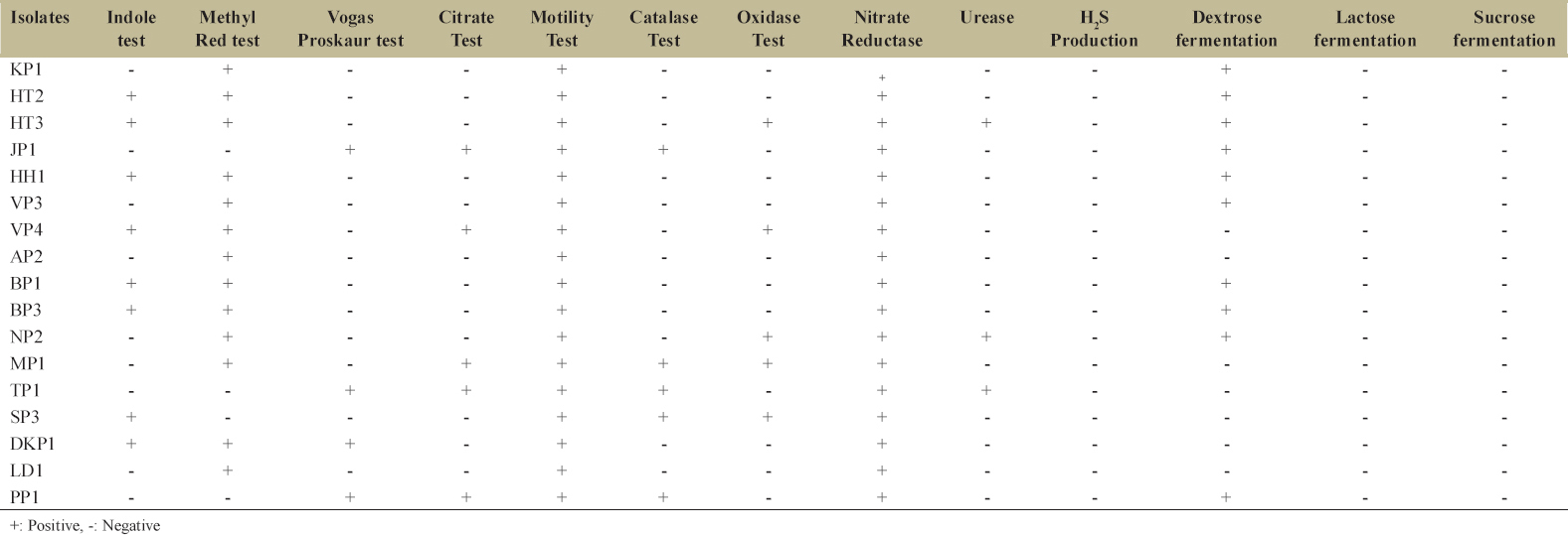| Isolates | Indole test | Methyl Red test | Vogas Proskaur test | Citrate Test | Motility Test | Catalase Test | Oxidase Test | Nitrate Reductase | Urease | H2S Production | Dextrose fermentation | Lactose fermentation | Sucrose fermentation |