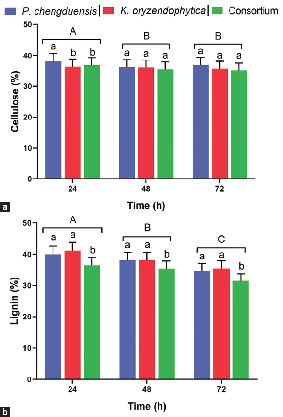 | Figure 2: Estimated cellulose and lignin contents in coir fiber after treatment using Pseudomonas chengduensis + Averrhoa bilimbi, Kozakonia oryzendophytica + Averrhoa bilimbi, and Consortium + Averrhoa bilimbi at different hours. (a) Cellulose and (b) Lignin percentages were obtained after every treatment tested at different hours. Six replications (Mean ± SE) were maintained for both estimations. Vertical bars under different small letters were statistically significant, and the same letters indicate statistically insignificant (Tukey test, LSD; P < 0.05) among the treatments (Pseudomonas chengduensis, Kozakonia oryzendophytica, and Consortium). Different capital letters on the top of the vertical bar indicate that every treatment tested at different hours (24, 48, and 72) was statistically significant (Tukey test, LSD; P < 0.05), and the same capital letters indicate statistically insignificant. [Click here to view] |