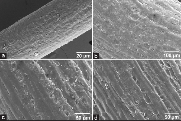 | Figure 3: Scanning electron micrographs of raw and treated fibers. (a) Raw fibers. (b) Pseudomonas chengduensis + Averrhoa bilimbi extract treated fiber, (c) Kozakonia oryzendophytica + Averrhoa bilimbi extract treated fiber, and (d) Microbial consortium + Averrhoa bilimbi extract treated fiber. (Magnification at ×500). [Click here to view] |
