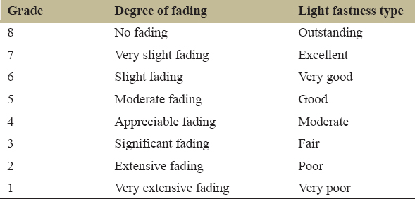 The Xeno test (Colorfastness to light, air-cooled xenon arc lamp), IS standard AATCC 16 H-1998, was used to determine the lightfastness of the treated fibers. It was done by exposing a fiber sample to a light source for a certain amount of time and then comparing it to an unexposed sample. The Xenotest can also be used to determine fiber quality by evaluating lightfastness ratings [16]. This is a permanent specification for evaluating the light fastness and weather fastness of target samples at a faster rate than is possible. A 1500-watt Xenon arc lamp is utilized in the Xenotest to provide radiation; the cleared spectrum of this lamp employed in the Xenotest is equivalent to sunlight. The fiber samples were exposed to light and dark for alternating intervals. This method comes close to simulating real day and night circumstances. To assess color change, exposure was stopped when the contrast between the exposed and unexposed portions of the specimen was equivalent to the greyscale grades. The tested and original fabrics were compared under a white light using the blue standard as a reference to determine color change [Table 1] [19].