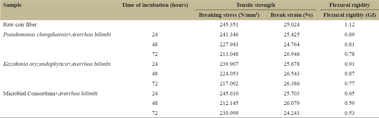 When the fibers were treated with the microbial consortium followed by A. bilimbi treatment at 72 h of incubation, the flexural rigidity decreased significantly from 1.12 (for untreated fiber) to the lowest of 0.53 [Table 2]. The outcomes show that treatment with the microbial consortia modifies the apparent structures of coir fibers without affecting the core structure or strength. Thus, the treatment is a favorable, economical, and biological technique for attaining softened coir fibers.