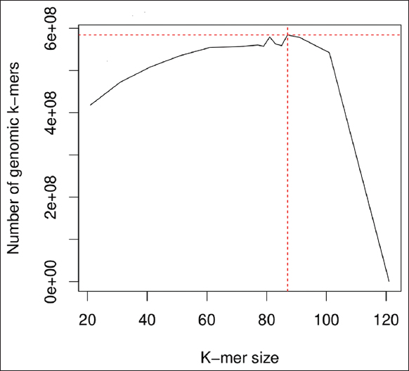 ![]() | Figure 1: The K-mer histogram for estimation of genome size in pygmy date palm. The figure shows K-mers size in the genome of pygmy date palm, that are predicted using KmerGenie version 1.7051. A graph was plotted with K-mer size on the X-axis and the number of genomic K-mers on the Y-axis and from the graph the K-mer size of 84 is selected for the genome assembly. The predicted genome assembly size of pygmy date palm is 584,473,888 bp. [Click here to view] |