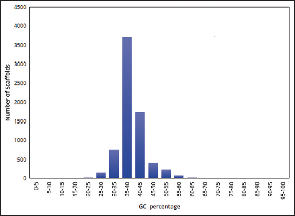 ![]() | Figure 2: The distribution of GC percentage in the assembled genome of pygmy date palm. The figure shows the distribution of GC percentage in the assembled genome of pygmy date palm. A graph was plotted with GC percentage range (GC%) on the X-axis and the number of scaffolds on the Y-axis. The GC percentage in the assembled genome of pygmy date palm is ~ 41.88%. [Click here to view] |