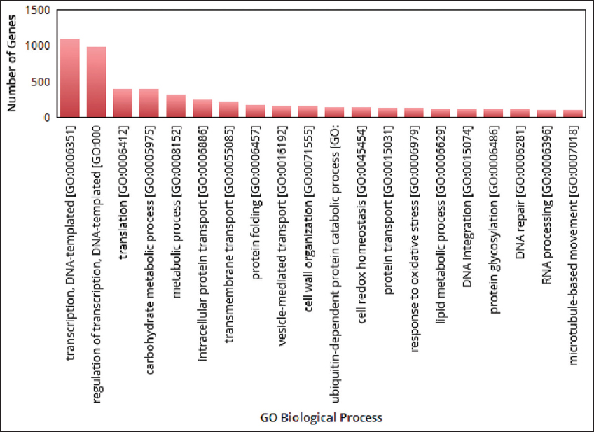 ![]() | Figure 4: The gene ontologies related to biological process observed in pygmy date palm. The figure shows gene ontologies related to biological process observed in pygmy date palm. A graph is plotted with gene ontologies of biological process on X-axis and number of genes on Y axis. [Click here to view] |
