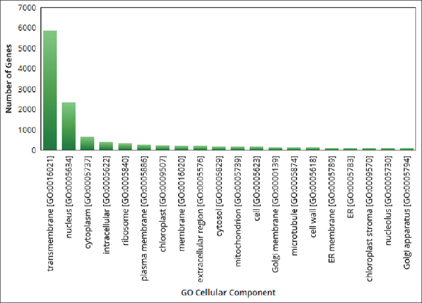 ![]() | Figure 5: The gene ontologies related to cellular component observed in pygmy date palm. The figure shows gene ontologies related to cellular components observed in pygmy date palm. A graph is plotted with gene ontologies of cellular components on X-axis and number of genes on Y axis. [Click here to view] |