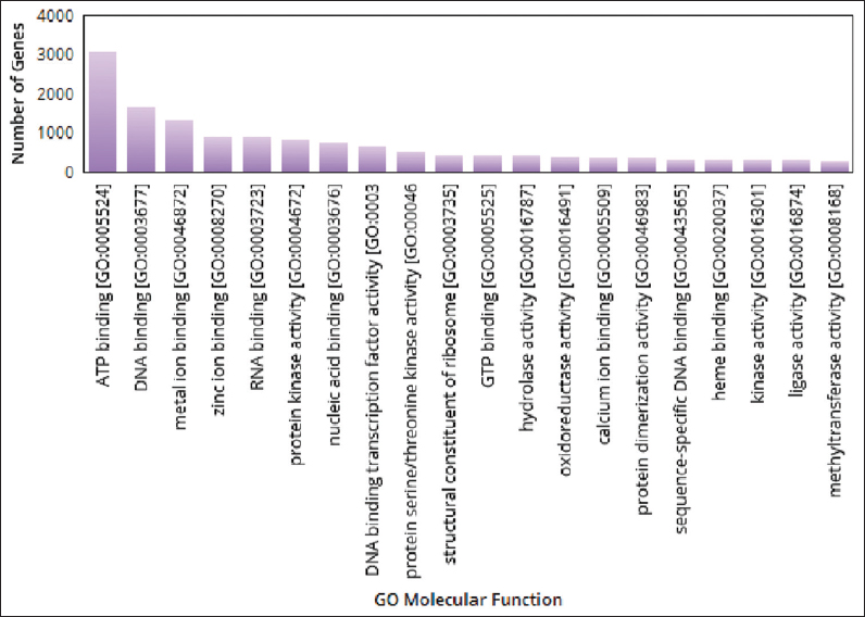 ![]() | Figure 6: The gene ontologies related to molecular function observed in pygmy date palm. The figure shows gene ontologies related to molecular functions observed in pygmy date palm. A graph is plotted with gene ontologies of molecular functions on X-axis and number of genes on Y axis. [Click here to view] |