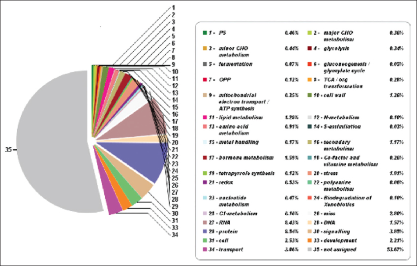 ![]() | Figure 7: The pathway summary predicted with Mapman. This figure shows thirty-four metabolic categories along with the participating percentage of genes having a significant role in metabolic pathways of pygmy date palm. Mapman analysis identified 46.33% genes having a significant role in metabolic pathways. [Click here to view] |