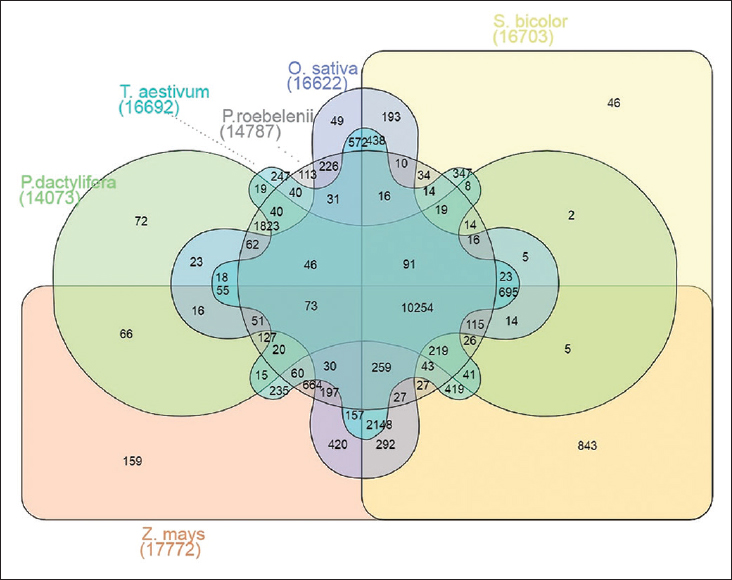 ![]() | Figure 8: The summary of genes in orthogroups between model plants Phoenix dactylifera and Phoenix roebelenii. This figure shows summary of genes in orthogroups as revealed by orthologous analysis between Arabidopsis thaliana, Oryza sativa, Phoenix dactylifera, Sorghum bicolor, Triticum aestivum, Zea mays and Phoenix roebelenii. [Click here to view] |