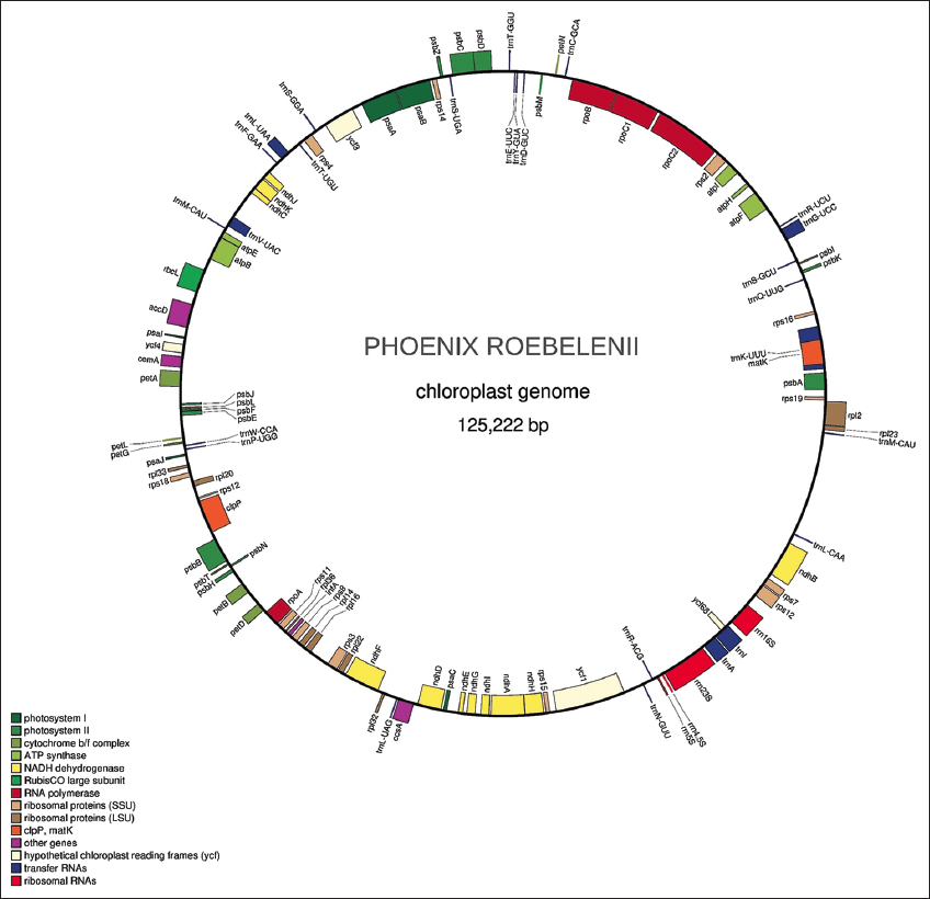 Phoenix roebelenii (pygmy date palm) is a popular “ornamental plant” and is associated with the family “Arecaceae” [5]. “Pygmy date palm” is a miniature palm tree having slim trunks and a beautiful crown of feathery leaves, small yellow flowers, and small edible black fruits [5]. “Pygmy date palm” is a variety of date palms indigenous to southwestern China and northern Vietnam and is grown well in warm, tropical, and subtropical gardens [5]. The British royal horticultural society marked P. roebelenii with the Award of Garden Merit for its performance under UK growing conditions [6,7]. Pygmy date palm is resistant to pests, tolerant to soil variation, and moderately tolerant to drought. The NASA Clean Air Study established that this plant effectively removed regular domestic air pollutants benzene and formaldehyde [8]. Therefore, this study aims to report the draft nuclear and complete organelle genome sequences of P. roebelenii along with important ornamental traits.