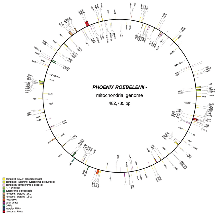 ![]() | Figure 11: The mitochondrial genome and annotation of pygmy date palm. This figure shows a circular mitochondrial genome of 482,735 bps generated without any gap using GetOrganelle version 1.6.4. This figure also shows mitochondrial genome annotation predicted using AGORA version 1. [Click here to view] |