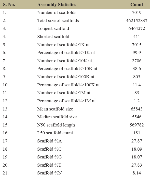 The whole-genome sequence data of 32.2 GBs from NCBI Bio project PRJNA629103 is retrieved. There were 214,907,072 reads with GC content of 42.43% and 93.885% data ≥Q30 with read length of 2 × 150 bp. The adapter removal and quality trimming resulted in 214, 767, 420 reads with a GC content of 41.88%. The quality of the bases with ≥Q30 is 94.265%, and the genome size was 584,473,888 bps [Figure 1]. The de novo assembly generated 7019 scaffolds with an assembly size of 462,152,837 bps. The longest scaffold is 6,464,272 bps, and the shortest scaffold is 411 bps [Table 1]. The assembled genome’s GC content and scaffold length distribution were calculated and are shown in Figure 2 and 3, respectively. The GC content of the assembled genome is ~41.88%. BUSCO version 4.1.2 evaluated the assembled genome, and the assembly was 84.2% complete [Table 2].