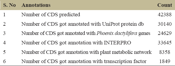 | 3 | Number of CDS got annotated with Phoenix dactylifera genes | 24629 |