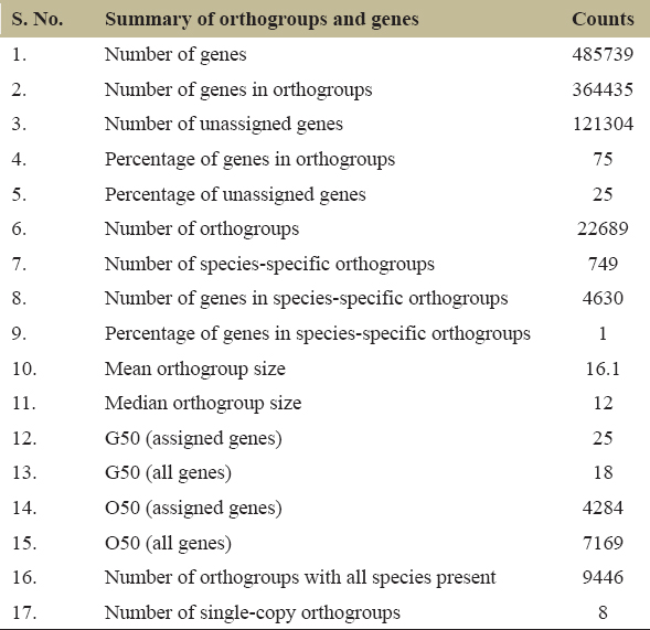 | S. No. | Summary of orthogroups and genes | Counts |