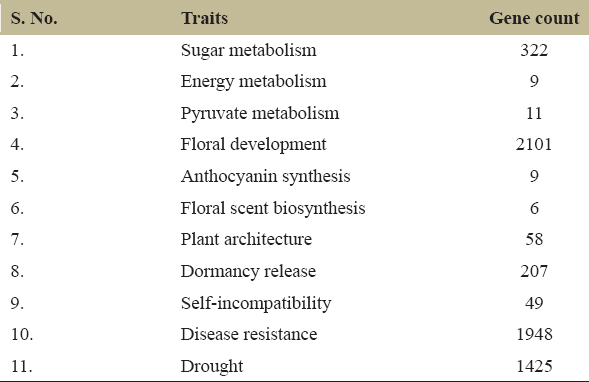 The genes associated with the important ornamental traits such as “fruit development and ripening,” “floral development,” “anthocyanin synthesis,” “floral scent biosynthesis,” “plant architecture,” “dormancy release,” “self-incompatibility,” “disease resistance,” and “drought” were discovered. The “carbohydrate metabolism” is the extreme pathway in fruit development and ripening of fruit. “Energy metabolism” is the next metabolic pathway which is expressed highly followed by “metabolism of other amino acids.” The number of genes identified in sugar, energy, and pyruvate metabolisms is 322, 9, and 11, respectively. The number of genes identified in association with controlling “floral development,” “anthocyanin synthesis,” “floral scent biosynthesis,” “plant architecture,” “dormancy release,” “self-compatibility,” “disease resistance,” and “drought” are 2101, 9, 6, 58, 207, 49, 1948, and 1425, respectively. The criteria used to identify the genes related to ornamental traits are homology identity cutoff of 80% and query coverage cutoff of 80%. The summary of gene count and genes associated with ornamental traits is presented in Table 7 and Supplementary Tables 1-11, respectively.