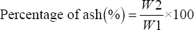 For ash content determination, a total of 5 g of the samples was weighed into the crucible and the samples were dried at 550°C for 24 h in the furnace [8]. The crucible’s Weight was taken over the ash process was completed, and the control was carried out without samples. The ash was expressed as a percentage of the initial fresh sample weight. The percentage was calculated using the following method:
