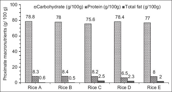 ![]() | Figure 2: The proximate macronutrients of selected Malaysian rice varieties (g/100 g). There is no significant difference on One-Way ANOVA test, p>0.05 [Click here to view] |