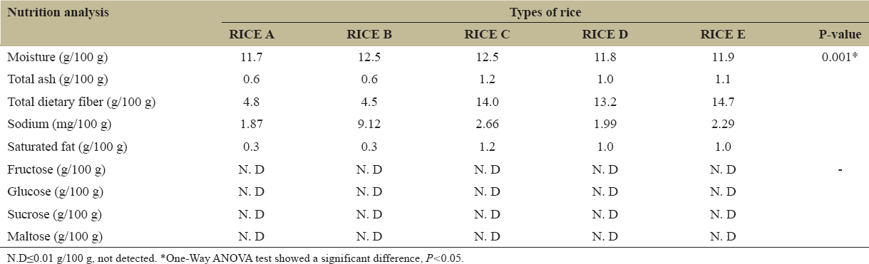 A study conducted on five different rice varieties on selected Malaysian rice indicated comparable nutrient levels except for total sugars (fructose, glucose, sucrose, and maltose), which were not detected. It was observed that Rice D gives the highest calories, Rice C gives the lowest carbohydrate level, and Rice B gives the highest protein and lowest fat levels. Differences were found between ash, moisture, total dietary fiber, sodium, and saturated fat contents among different rice varieties (P < 0.05). Rice varieties’ sodium and saturated fat showed exceptionally low levels. While it was found the highest level of total dietary fiber was analyzed in Rice E. Thus, it was observed that Rice C could represent a reliable source of high dietary fiber, low carbohydrate intake food, and comparable values of other nutrient analysis with the potential use as a healthy option. In addition, the findings could assist consumers with better choice options in estimating the nutrient intake of the variety of rice available.