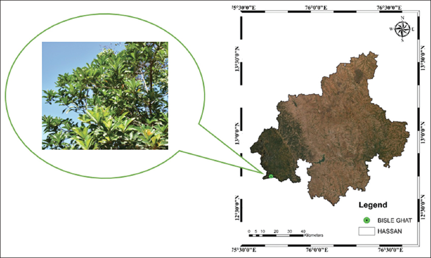 The genus Holigarna is a large and lofty evergreen tree with acrid juice in the stem and leaves. About eight species have been reported from India and Indochina [19], and they are endemic to the Western Ghats, common from the South to the Central Sahyadri, and rare in the North Sahyadri. Low-elevation canopy trees in semi-evergreen to wet evergreen forests [13]. The plant samples were collated from the Bisle Ghat (12°42′42″ N: 75°41′17″E) one of the evergreen forest regions in Hassan District, Karnataka, India. The plant and collection site was shown in Figure 1.